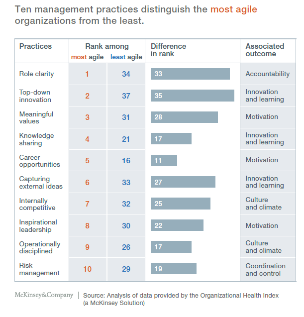 If we take a really useful guide produced by McKinsey, taken from their article “Why agility pays” it does offer up many of the factors and associated outcomes that allows agility to flow within organizations. Ones to put in place to make us more agile and adaptive.