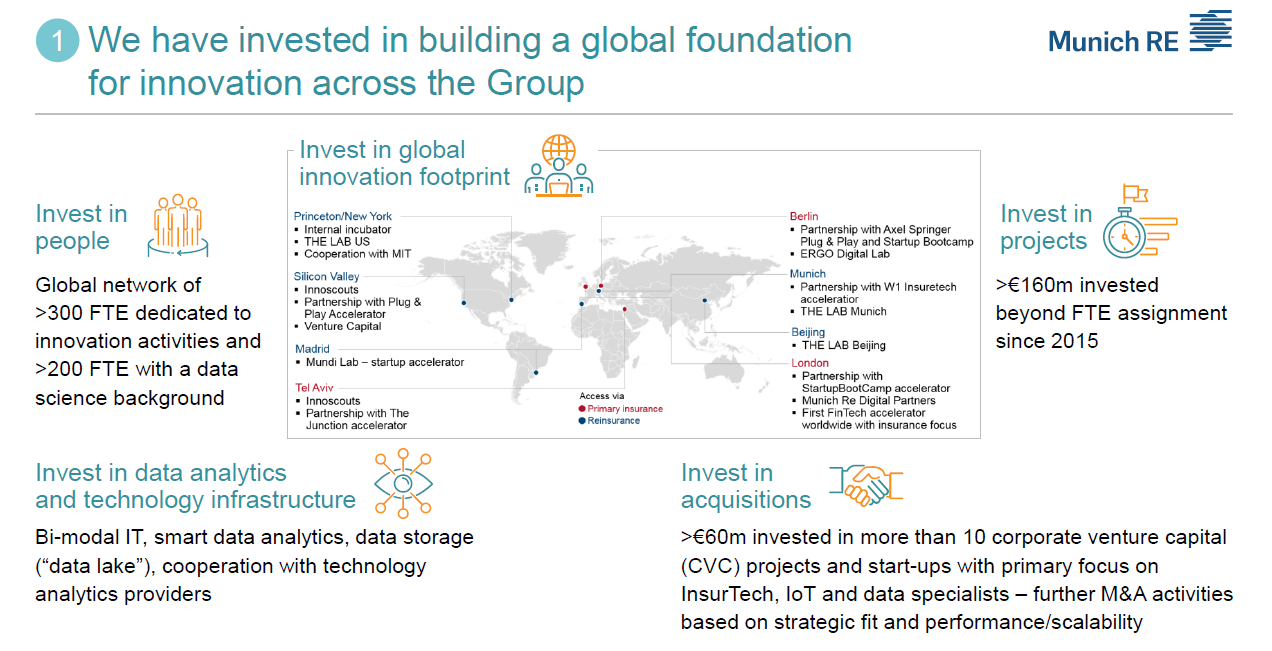 * All visuals used came from a Munich Re investor day presentation in November 2017 “Munich Re driving digital transformation” or the last slide for an early 2018 update in Presentations 2018, on Munich Re under “Current Company Presentation” under “Shaping change in insurance, Munich Re equity story” a download PDF, 1.5MB. Both of these released into the general public domain from their publications section.