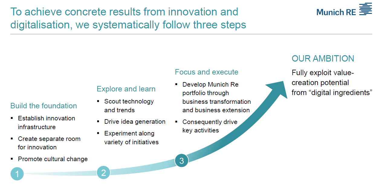 Without a doubt the presentation was well-structured. It shows this is a journey they are embarking on and you get that clarity from the commitment from the top in exploring avenues that can lead to new opportunity or new learning. This is no finished roadmap but it does give investors and multiple stakeholders a really decent understanding of how Munich Re are managing their transformational journey