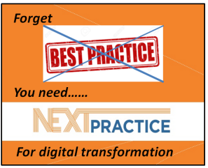 We are all presently learning a new practice. We need to find our individual ways, not copy someones else as this renders us as laggards or imitators, and who wants to have that label? The past best practices are now a very poor playbook for the future digital connected world. We need to ditch much of the endeavors that make up a legacy of past practice, and think forward, to which the term next practice becomes the learning spot.