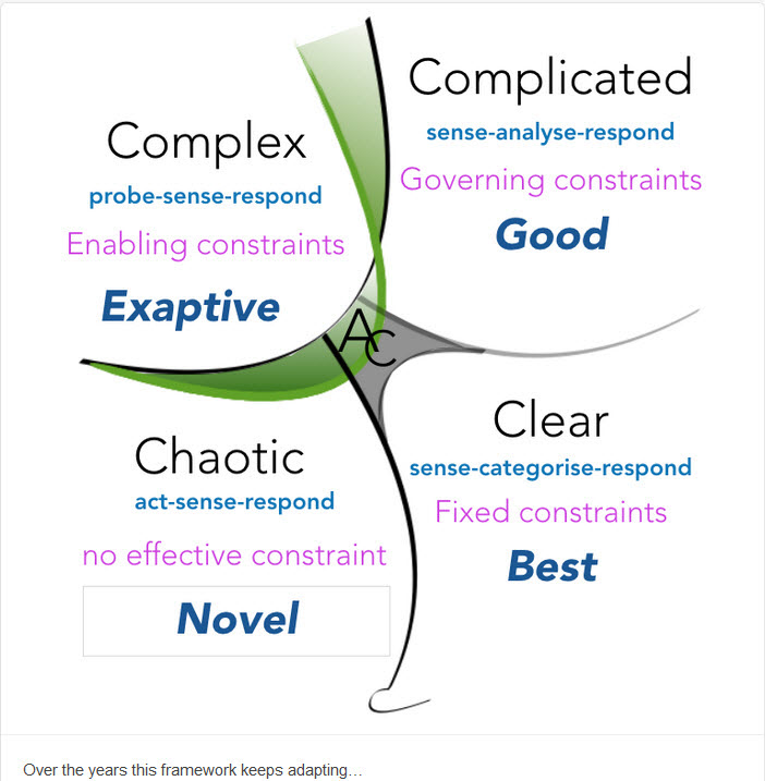 The Cynefin framework is from Dave Snowden through Cognitive Edge. The positioning of Cognitive Edge is “making sense of complexity in order to act.”